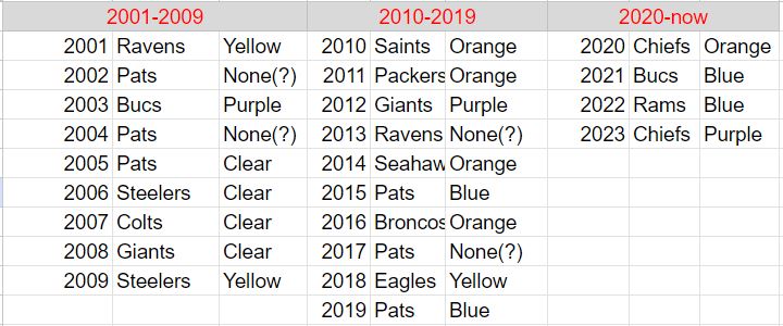 It’s crazy how many times it hasn’t happened in the last 24 years, but I guess the patriots just assumed they’d be back? The run on clear in the from 2005-2008 was incredible as well. According to Fanduel, Orange is the favorite at +240 and clear is the long shot at +1000. I’m going to focus more on the colors with middling odds. Yellow/Green at +380 looks pretty tasty since it hasn’t been used this decade, yet. I’ll do this and sprinkle a blue since it’s been such a popular color. Red isn’t on the list and I have to agree. Red Gatorade is great for a hangover/relaxing outside, but who wants to drink that when working out? Too heavy.