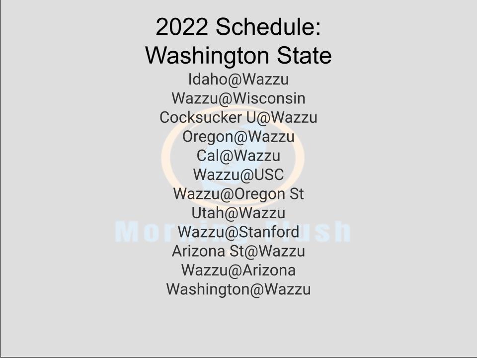 Previous prognostications: Washington Schedule/Predicted wins: Idaho@WazzuWazzu@WisconsinCocksucker U@WazzuOregon@WazzuCal@WazzuWazzu@USCWazzu@Oregon StUtah@WazzuWazzu@StanfordArizona St@WazzuWazzu@ArizonaWashington@Wazzu Predicted record: 5-7Floor: 3-9Ceiling: 9-3 The polarity of this team is hilarious. I have no idea what to expect from this team with ex-Wyoming DC (half their staff came over from Wyoming) and interim-turned-full-time HC Jake Dickert. He was able to pry Eric Morris, head coachContinue reading “Pac-12 Prognostications: Washington State”