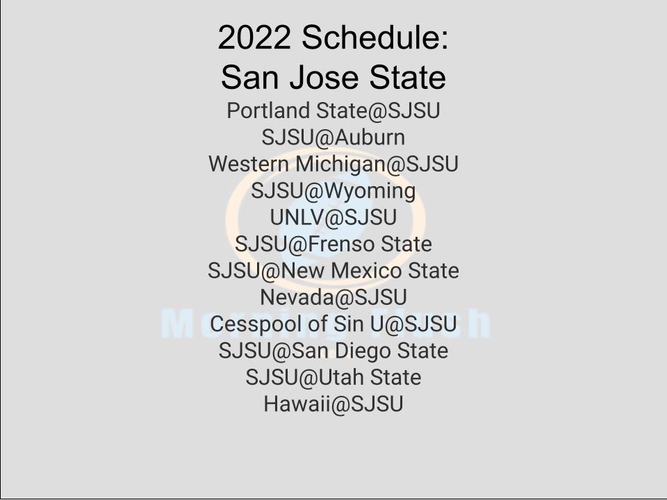 Previous MWC Prognostications: Hawaii Schedule/predictions Portland State@SJSUSJSU@AuburnWestern Michigan@SJSUSJSU@WyomingUNLV@SJSUSJSU@Frenso StateSJSU@New Mexico StateNevada@SJSUCesspool of Sin U@SJSUSJSU@San Diego StateSJSU@Utah StateHawaii@SJSU Predicted record: 4-8Floor: 2-10Ceiling: 7-5 Don’t come at me with the “BuT tHeY wOn ThE cOnFeReNcE iN2020” bullshit. Everyone knows that was a Mickey Mouse Covid title. With the graduation of Nick Starkel and key offensive weapons, soContinue reading “MWC Prognostications: San Jose State”