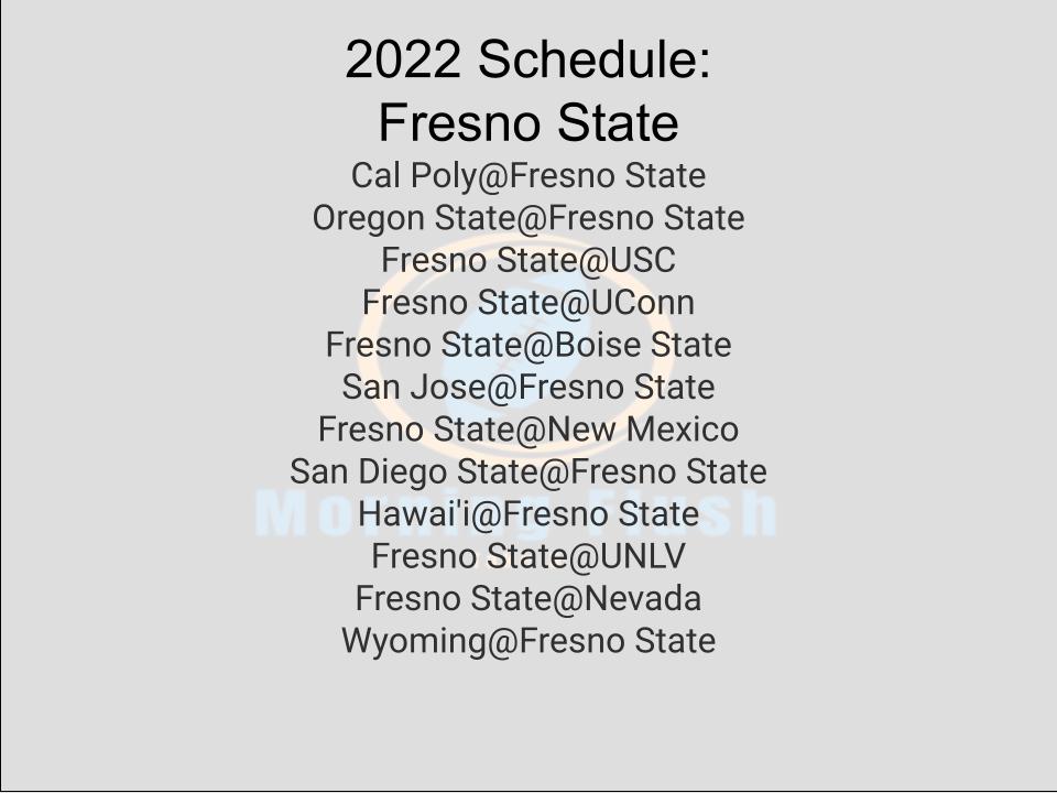 Schedule/Predicted wins Cal Poly@Fresno StateOregon State@Fresno StateFresno State@USCFresno State@UConnFresno State@Boise StateSan Jose@Fresno StateFresno State@New MexicoSan Diego State@Fresno StateHawai’i@Fresno StateFresno State@UNLVFresno State@NevadaWyoming@Fresno State Predicted record: 10-2Floor: 8-4Ceiling: 12-0 Fresno State might be the best group of 5 team in the country, but this schedule is absolutely brutal. They play a good Oregon State team at home,Continue reading “MW Crystal Ball: Fresno State”